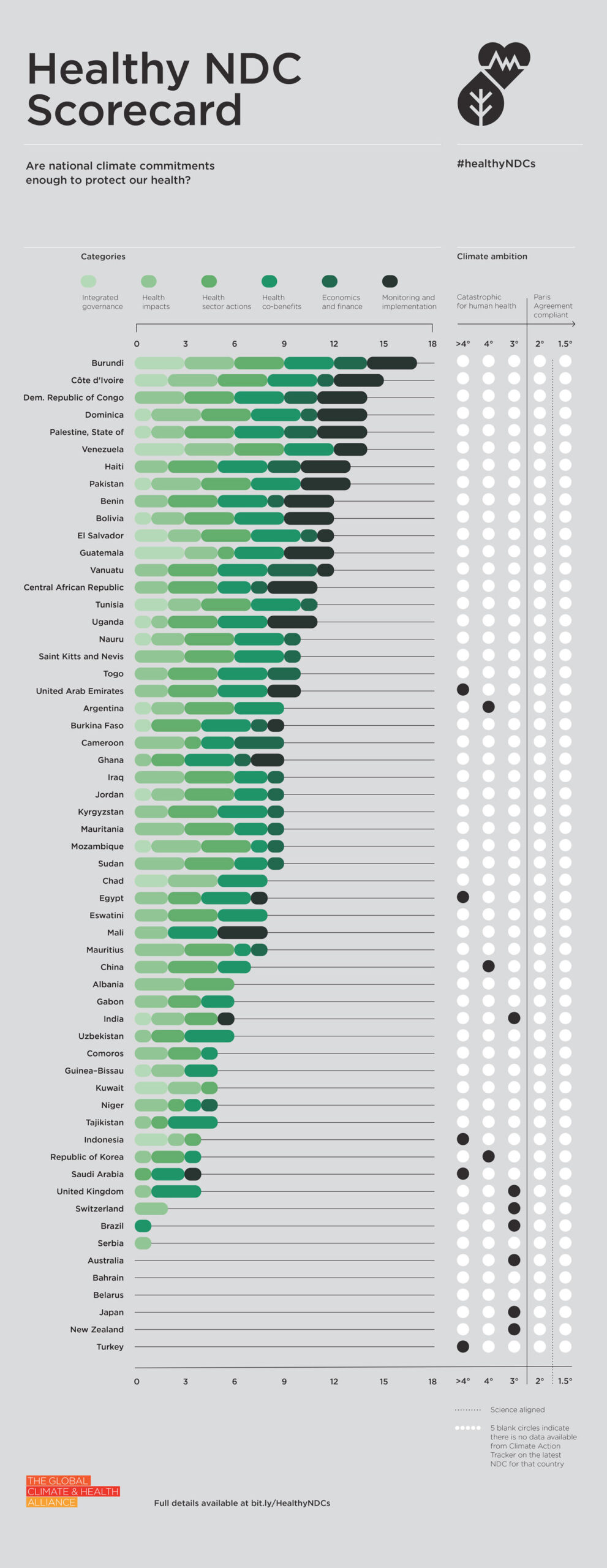 Nationally Determined Contributions (NDCs) are country commitments to deliver the goal of the Paris Agreement, limiting global temperature rise to well below 2C, and preferably to 1.5C. The 2023 edition of the Healthy NDC Scorecard assesses the consideration of health in the 58 NDCs submitted between 1st October 2021 and 23rd September 2022