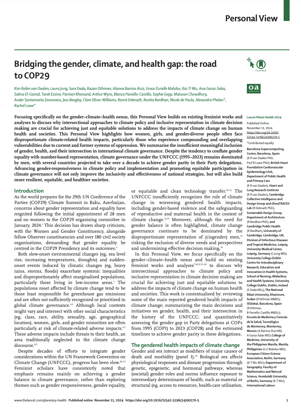 Focusing specifically on the gender–climate–health nexus, this Personal View builds on existing feminist works and analyses to discuss why intersectional approaches to climate policy and inclusive representation in climate decision making are crucial for achieving just and equitable solutions to address the impacts of climate change on human health and societies.